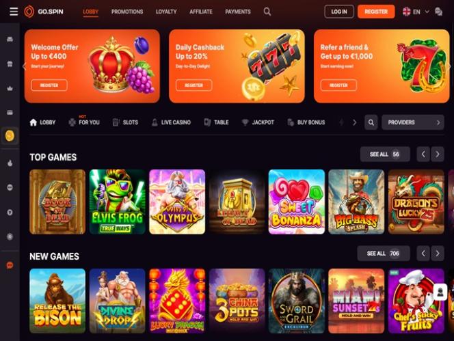 GoSpin Casino 采用现代化设计风格,界面简洁明快,配色舒适。首页布局合理,游戏分类清晰,支持快速筛选和搜索功能,方便玩家迅速找到喜欢的老虎机游戏。